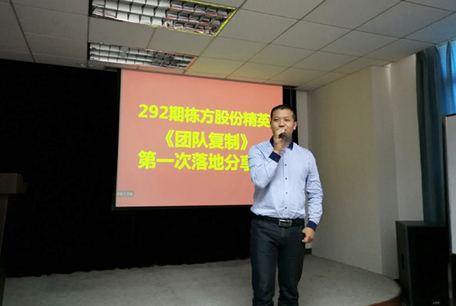 2017年11月23日,棟方股份精英《團(tuán)隊(duì)復(fù)制》第一次落地分享會在公司員工培訓(xùn)室舉行,與會人員除公司邱副總經(jīng)理、黃副總經(jīng)理、人事行政中心胡總監(jiān)及各精英團(tuán)隊(duì)負(fù)責(zé)人之外,還有幸邀請到聚成金牌講師李經(jīng)理一行蒞臨指導(dǎo)。